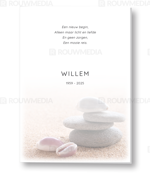 In deze staande rouwkaart wordt een beeldvullende afbeelding weergegeven van opgestapelde stenen op het zand. Onder de afbeelding kunt u de naam en datums weergeven.