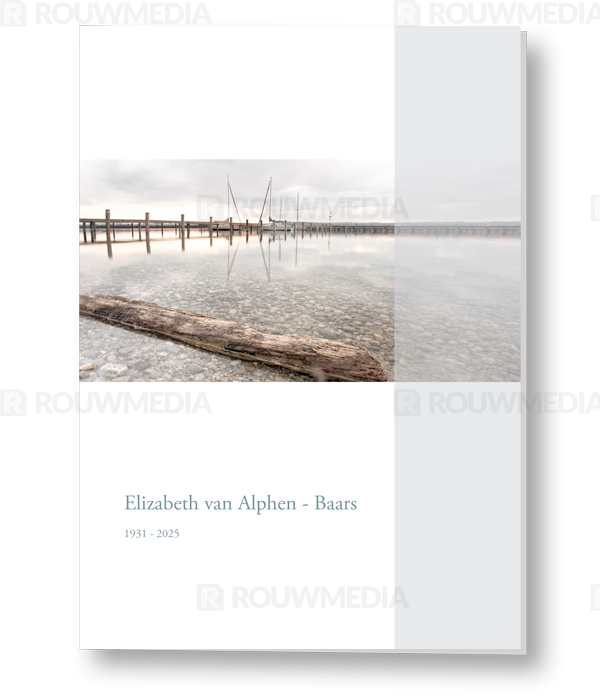 Rouwkaart met afbeelding van het strand en de golfbrekers. Aan de rechterkant wordt een transparante balk weergegeven om de kaart wat meer kleur te geven en speelser te maken.