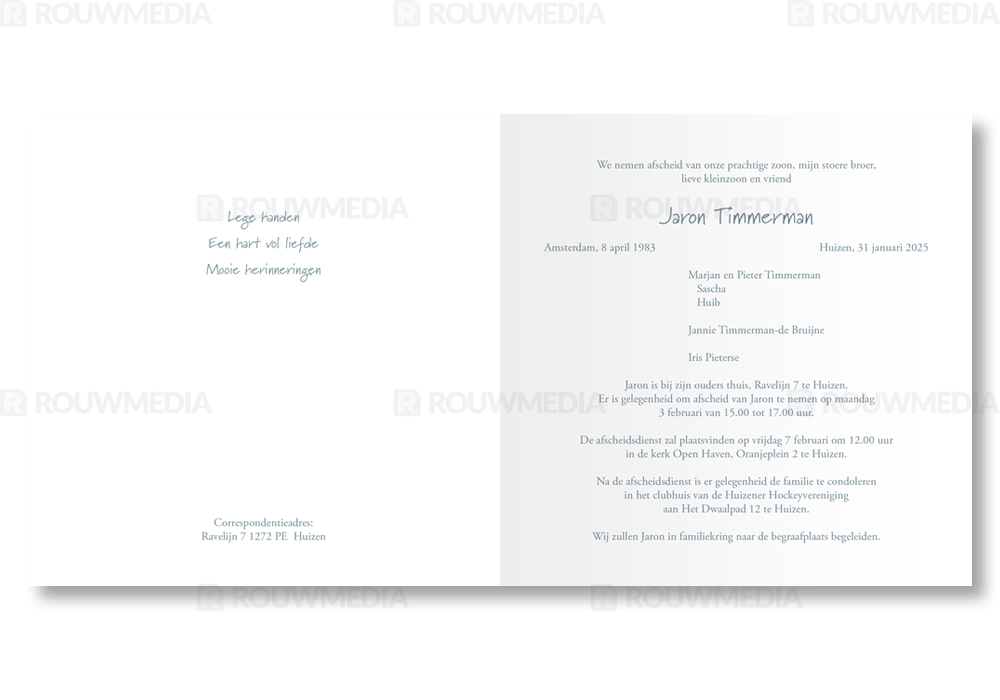 Rouwkaart met mogelijkheid om eigen portret/afbeelding weer te geven in langwerpige balk. Aan de rechterkant wordt een transparante balk weergegeven om de kaart wat meer kleur te geven en speelser te maken.