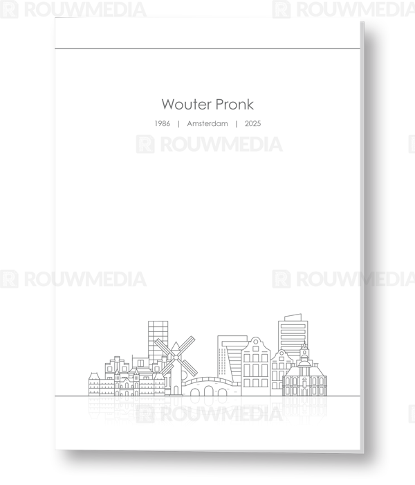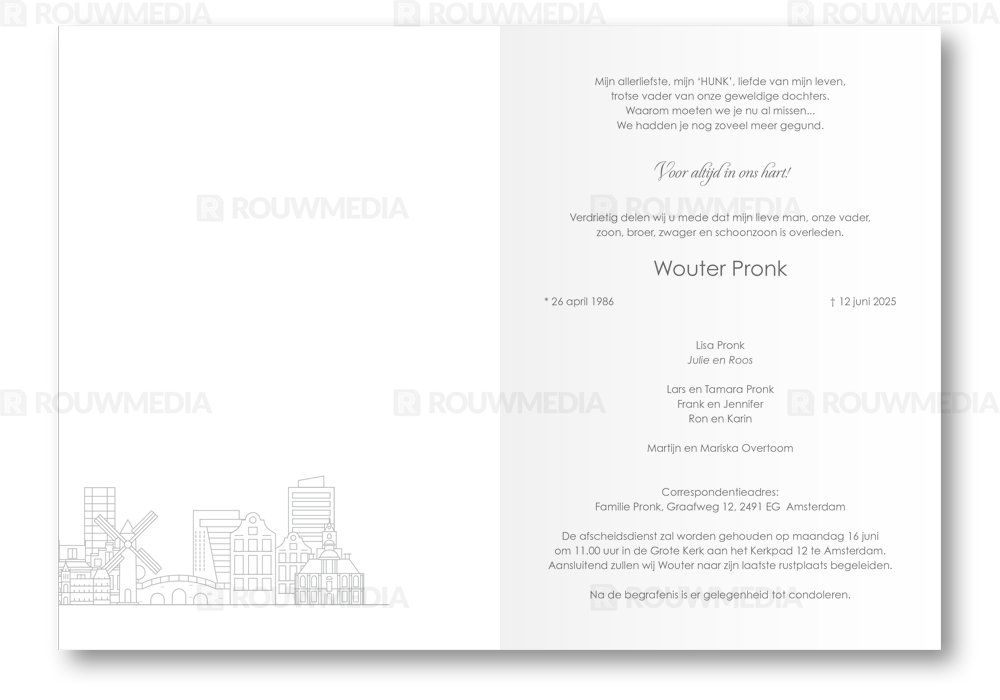 In deze recht staande kaart wordt een afbeelding weergegeven een tekening van de Skyline van Amsterdam. Daarnaast is het mogelijk om de naam, data en gedicht/citaat weer te geven.