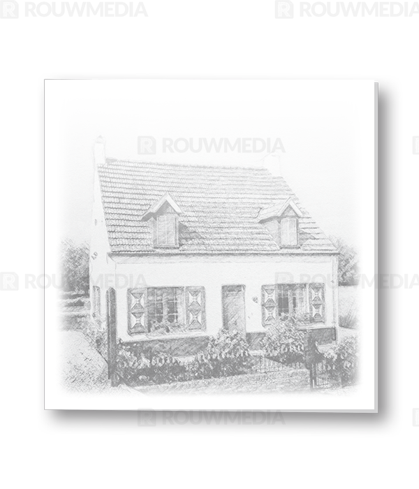 Bij deze rouwkaart heeft u de mogelijkheid om een eigen foto of portret aan te leveren van een woning of gebouw. Deze afbeelding wordt dan zo opgemaakt dat het net een schetstekening is.