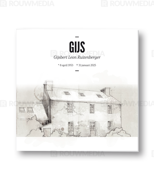Bij deze vierkante rouwkaart heeft u de mogelijkheid om een eigen foto of portret aan te leveren van een woning of gebouw. Deze afbeelding wordt dan zo opgemaakt dat het net een schetstekening is.