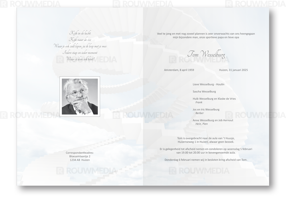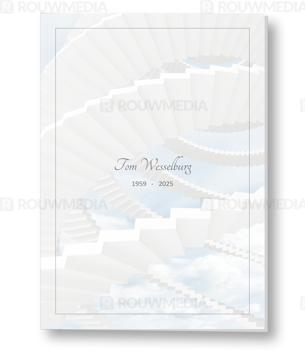 Voor deze staande rouwkaart is een dun grijs kader gebruikt. Achter dit kader is een beeldvullende afbeelding van een trap naar de hemel weer gegeven.