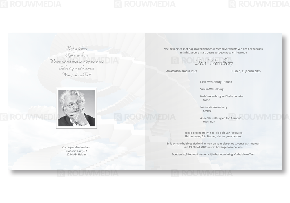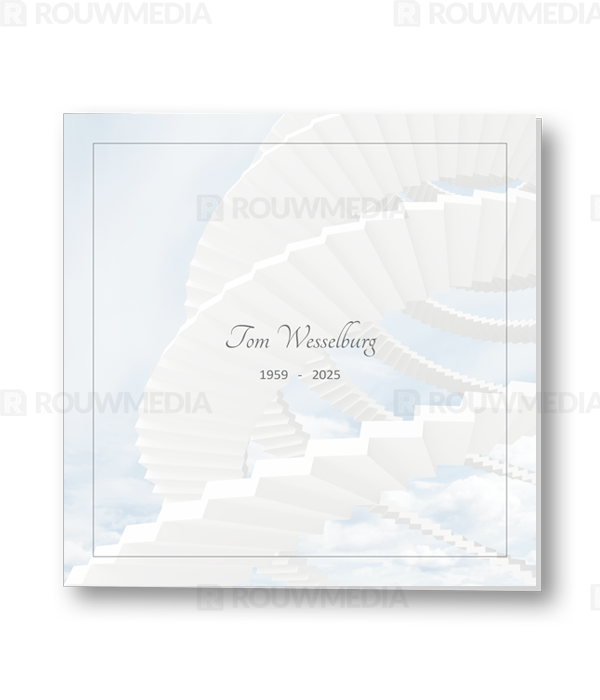Voor deze vierkante rouwkaart is een dun grijs kader gebruikt. Achter dit kader is een beeldvullende afbeelding van een trap naar de hemel weer gegeven.