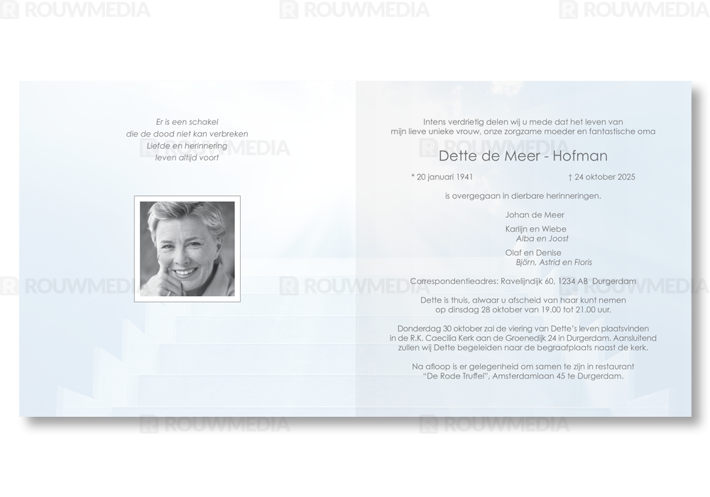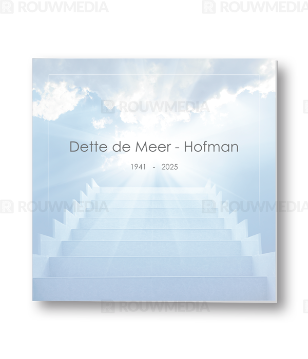 Voor deze rouwkaart is een dun grijs kader gebruikt. Achter dit kader is een beeldvullende afbeelding van een trap naar de hemel weer gegeven.