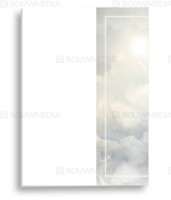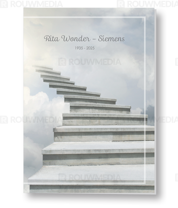In de staande rouwkaart wordt een beeldvullende foto weergegeven van een trap die richting de hemel gaat.