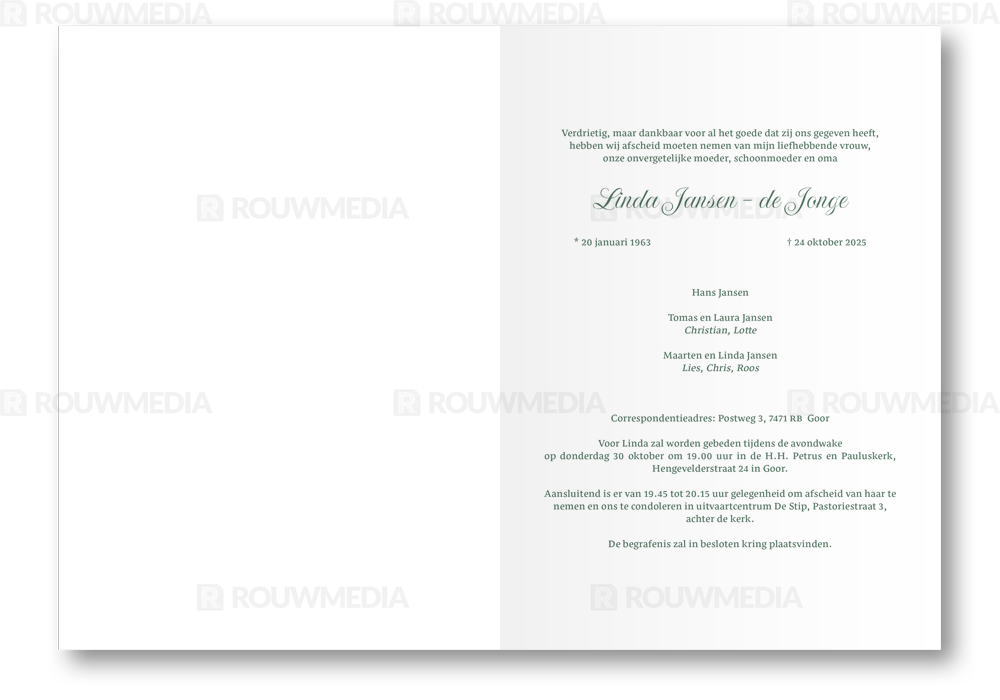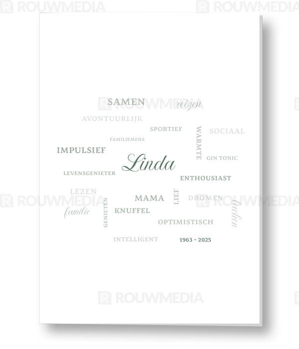 In deze rouwkaart kunt u verschillende woorden verwerken die typerend zijn voor de overledenen. Deze woorden worden om de naam heen weergegeven.