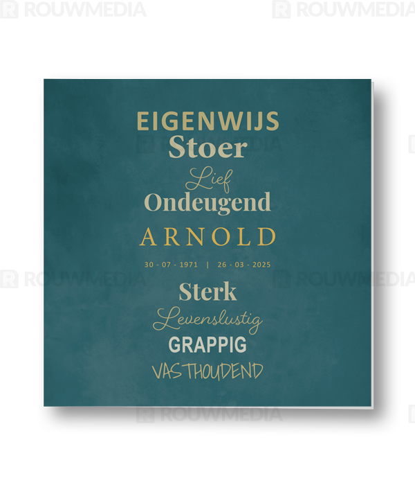 Rouwkaart met typografische weergave van eigenschappen