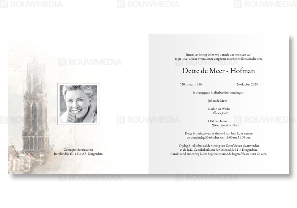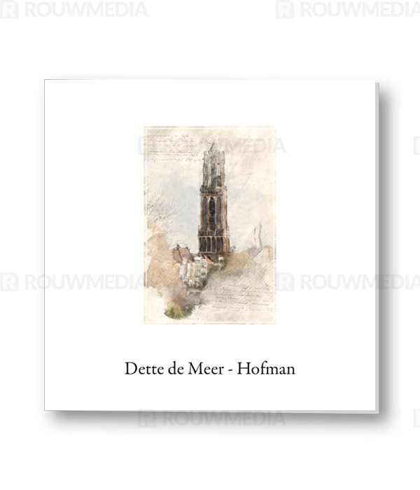Deze rouwkaart maakt onderdeel uit van de reeks schets afbeeldingen. Op deze kaart wordt de Domtoren van Utrecht weergegeven. Onder de schets kan de naam en datums worden getoond.