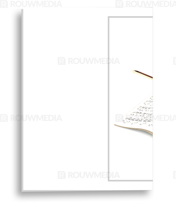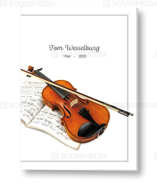 In de staande rouwkaart wordt een beeldvullende foto weergegeven van een viool op een muziekblad.