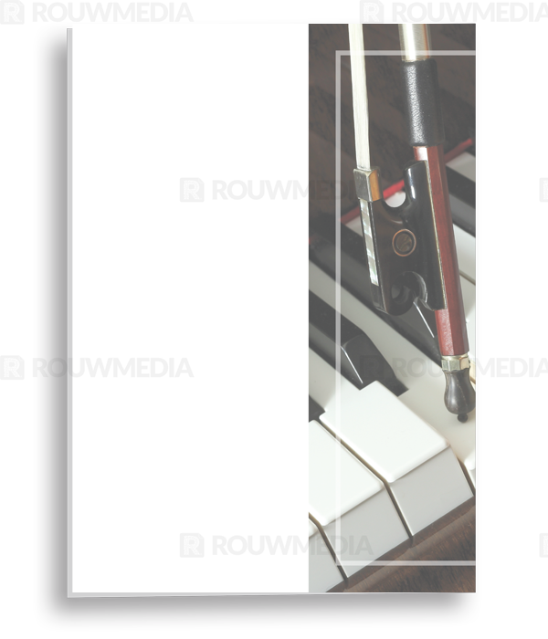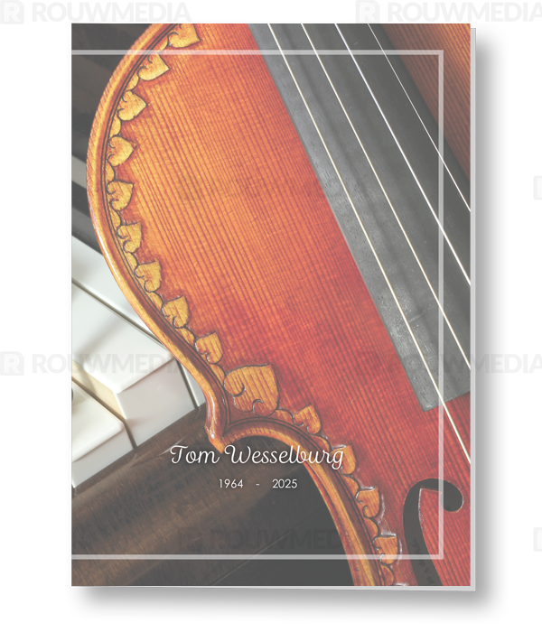 In de staande rouwkaart wordt een beeldvullende foto weergegeven van een viool met pianotoetsen.