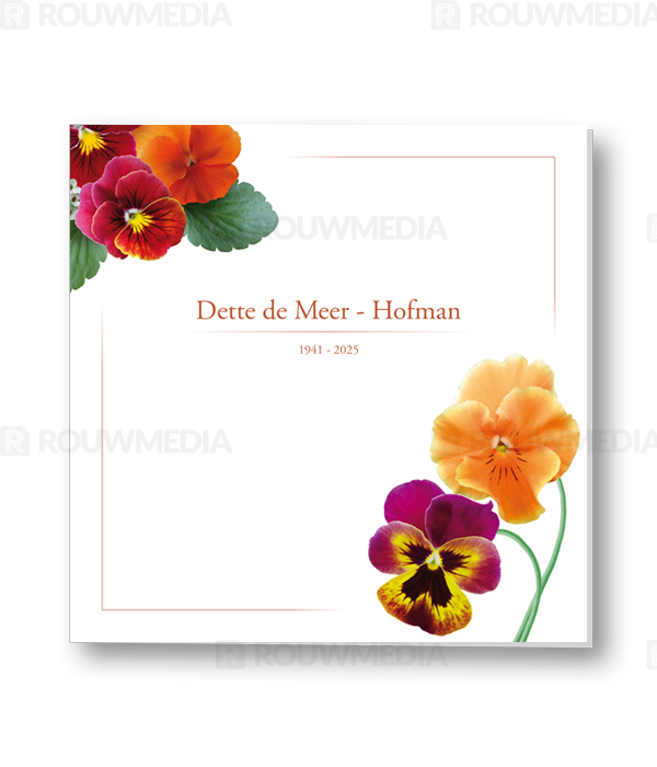 Op deze kaart worden viooltjes weergegeven, aan de binnenzijde van de kaart kan een portretfoto worden geplaatst met een kader eromheen.