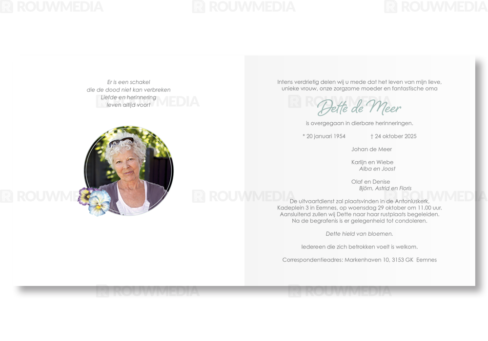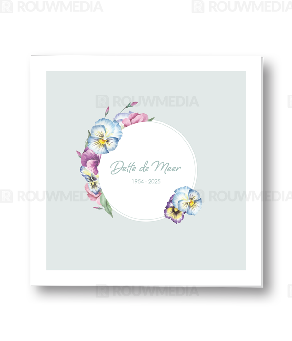 In deze vierkante rouwkaart wordt de naam en datums van de overledenen centraal gezet. Door een ronde cirkel met vleurige viooltjes wordt de naam extra geaccentueerd.
