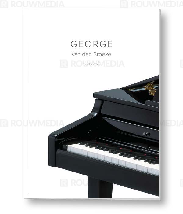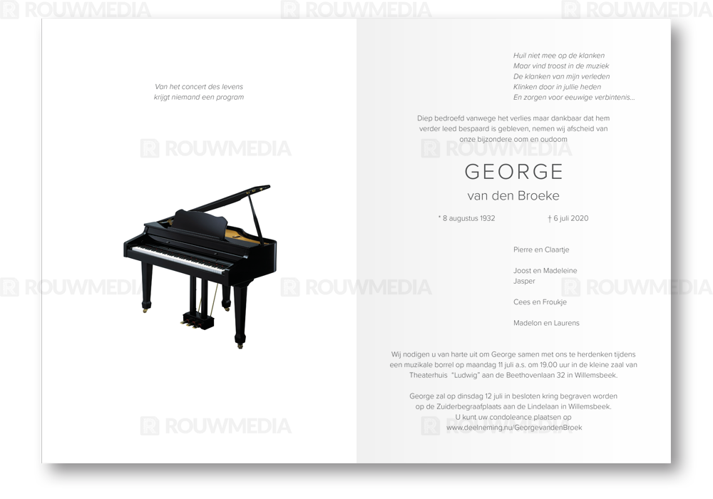 In deze staande rouwkaart wordt aan de rechter een afbeelding weergegeven van een pianovleugel.