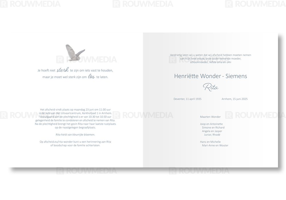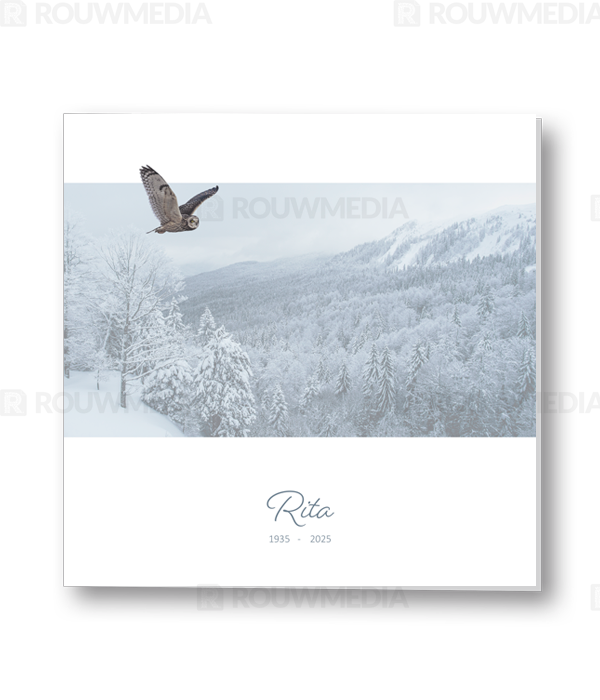Op deze rouwkaart wordt een vliegende uil getoond boven een besneeuwd sparrenbos in een wit winterlandschap