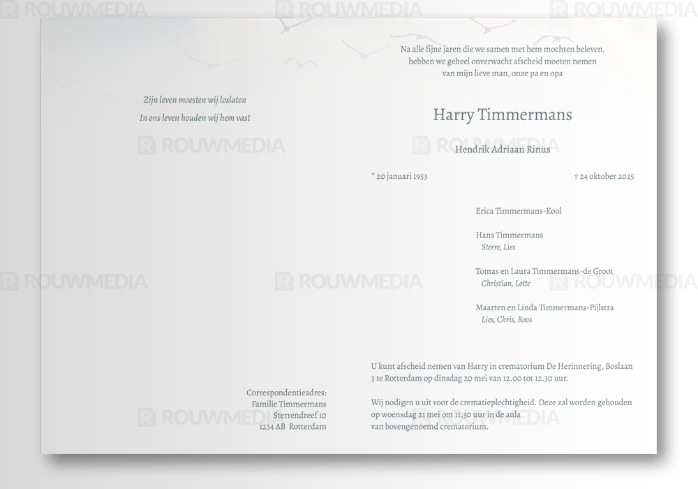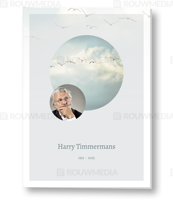 Bij deze rouwkaart wordt de vrijheid door middel van vogels in een grote cirkel weergegeven. Daarnaast is er ruimte voor een portret of afbeelding links weer te geven.