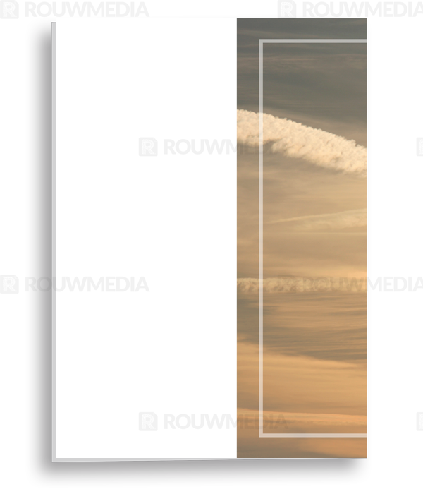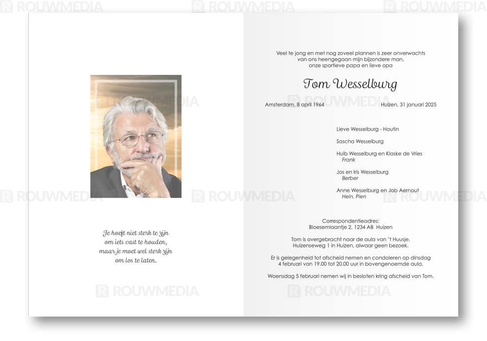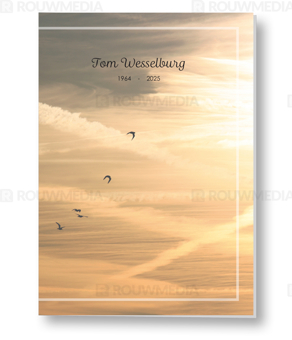 In de staande rouwkaart wordt een beeldvullende foto weergegeven van vliegende vogels in een blauwe lucht. Daarnaast is het mogelijk om een portret/foto naar eigen keuze rechts weer te geven naast de naam en datums.