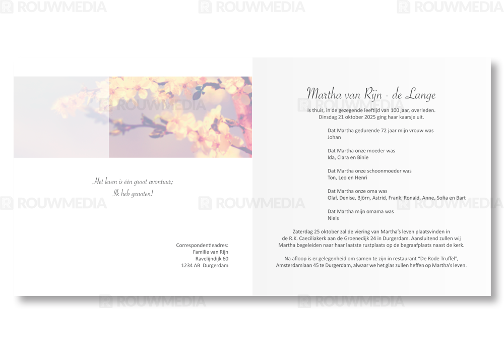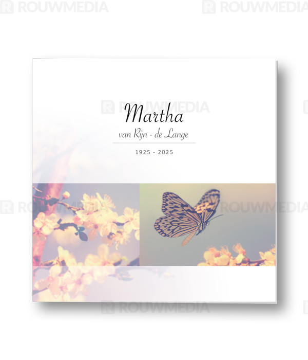 Op deze staande rouwkaart wordt een vlinder weergegeven. Daarboven is het mogelijk om een naam met datums weer te geven.