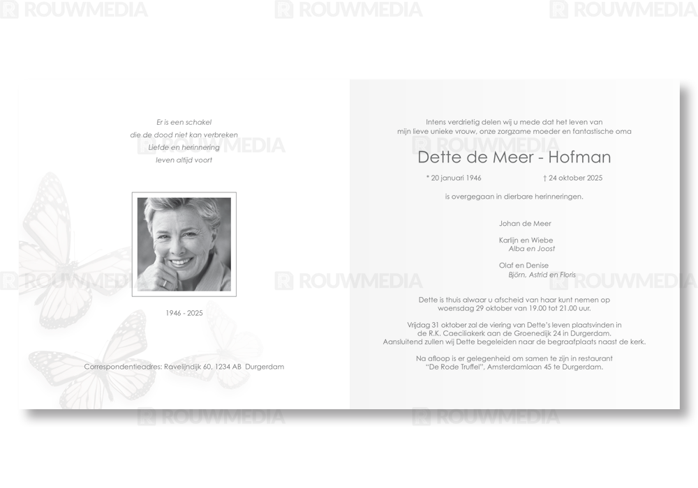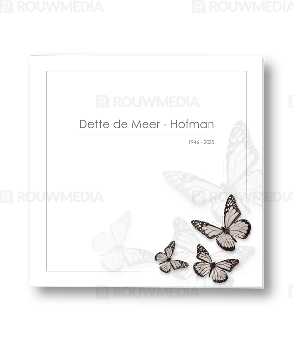 Deze vierkante rouwkaart toont in een simpele stijl hoe een afbeelding de focus kan krijgen in een kaart, maar wel de serene rust bewaart. Voor deze kaart is er gekozen voor vlindertjes.