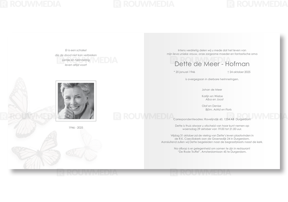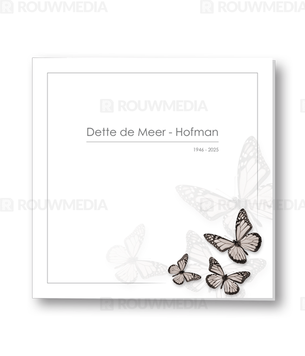 Deze vierkante rouwkaart toont in een simpele stijl hoe een afbeelding de focus kan krijgen in een kaart, maar wel de serene rust bewaart. Voor deze kaart is er gekozen voor vlindertjes.