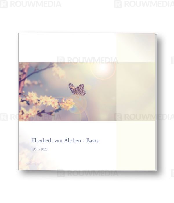 Rouwkaart met afbeelding van vlinder op een tak. Aan de rechterkant wordt een transparante balk weergegeven om de kaart wat meer kleur te geven en speelser te maken.