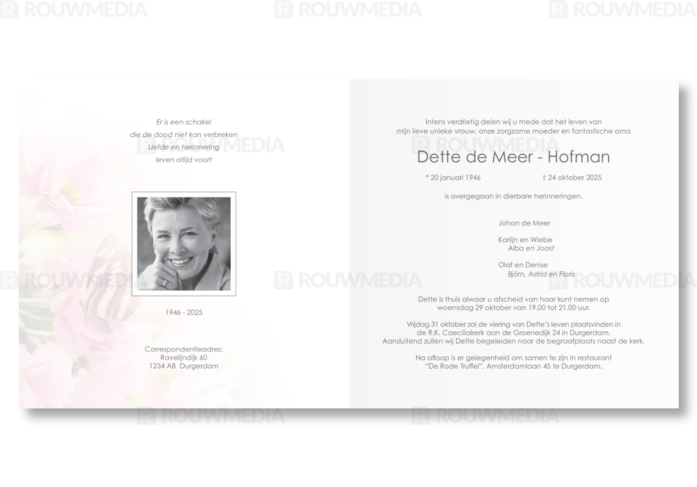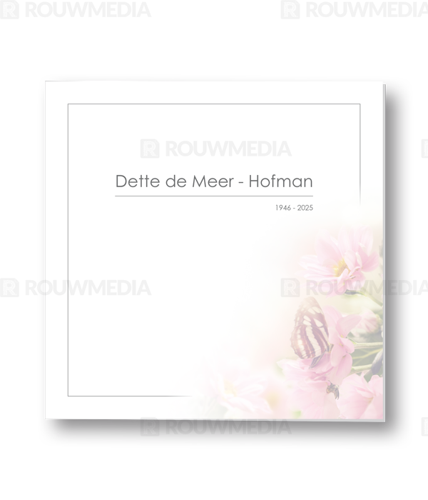 Deze vierkante rouwkaart toont in een simpele stijl hoe een afbeelding de focus kan krijgen in een kaart, maar wel de serene rust bewaart. Voor deze kaart is er gekozen voor een vlindertje op roze bloemen.