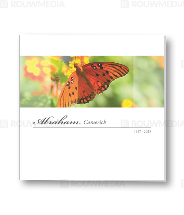 In deze vierkante rouwkaart wordt een horizontale afbeelding weergegeven van een vlindertje op een bloem.