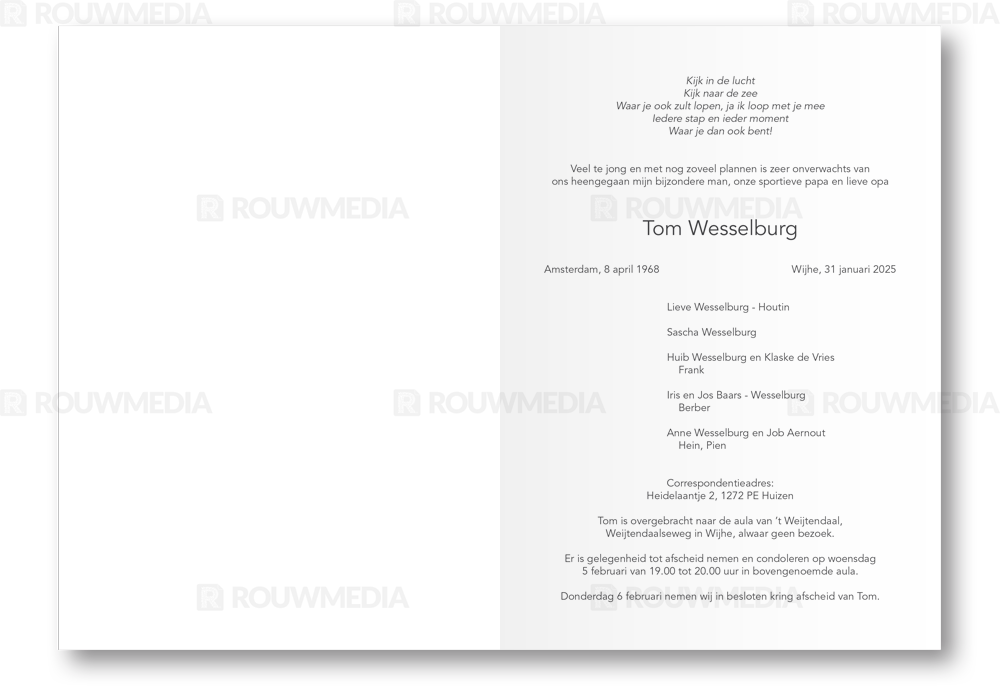 In deze staande rouwkaart wordt een sport/hobby weergegeven op een witte achtergrond. Het is ook mogelijk om de naam en datums weer te geven.