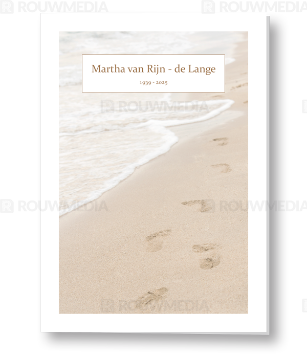 In de staande rouwkaart wordt een beeldvullende foto weergegeven van voetstappen in het zand.