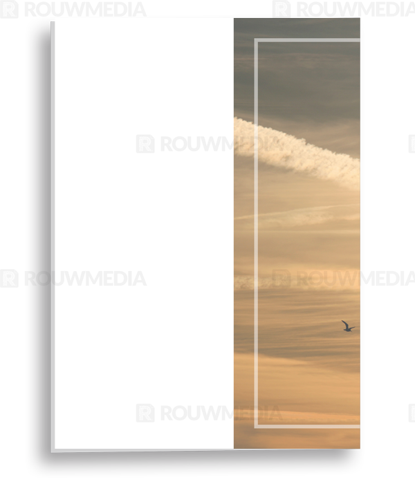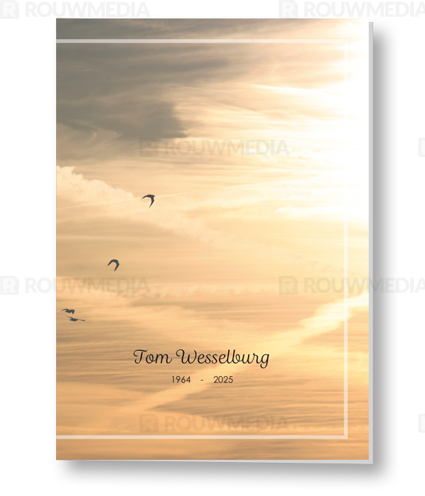 In de staande rouwkaart wordt een beeldvullende foto weergegeven van vliegende vogels in een oranje lucht.