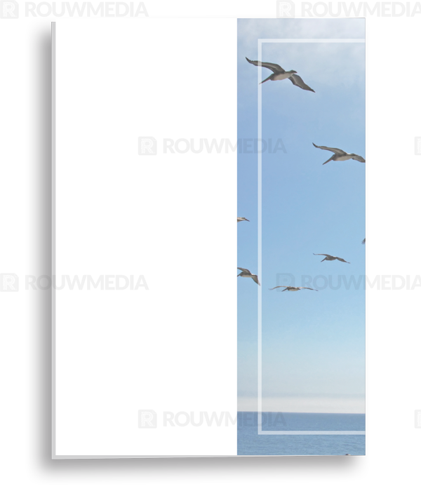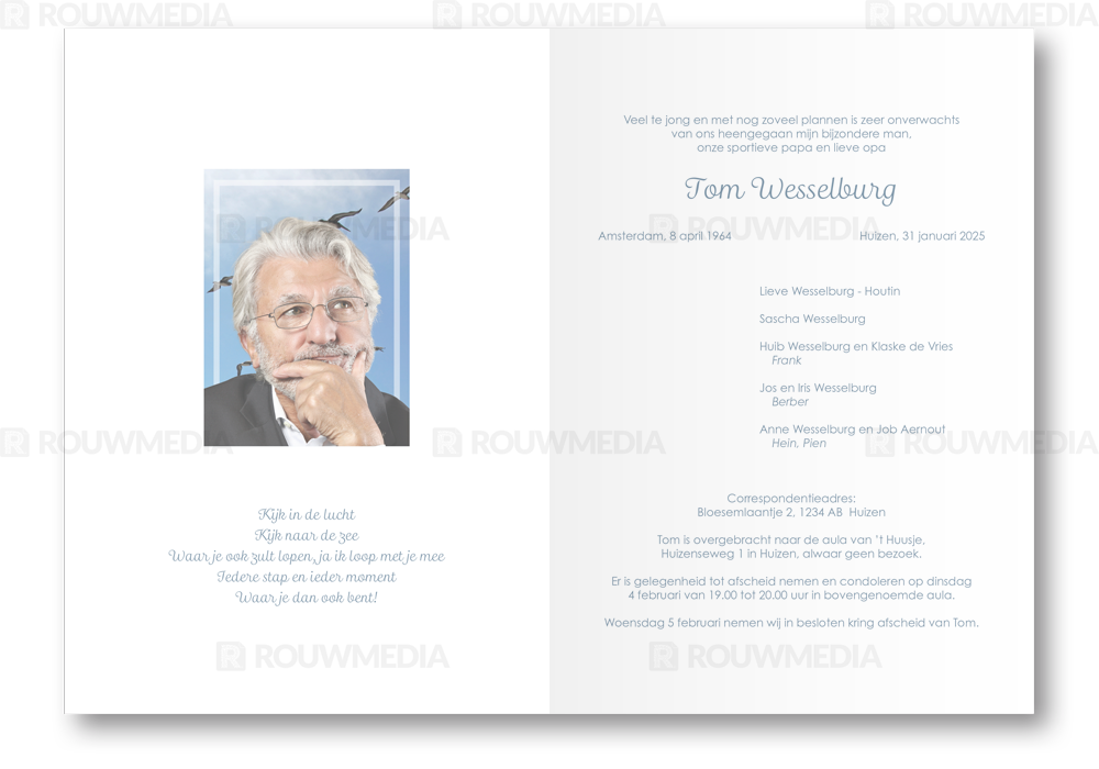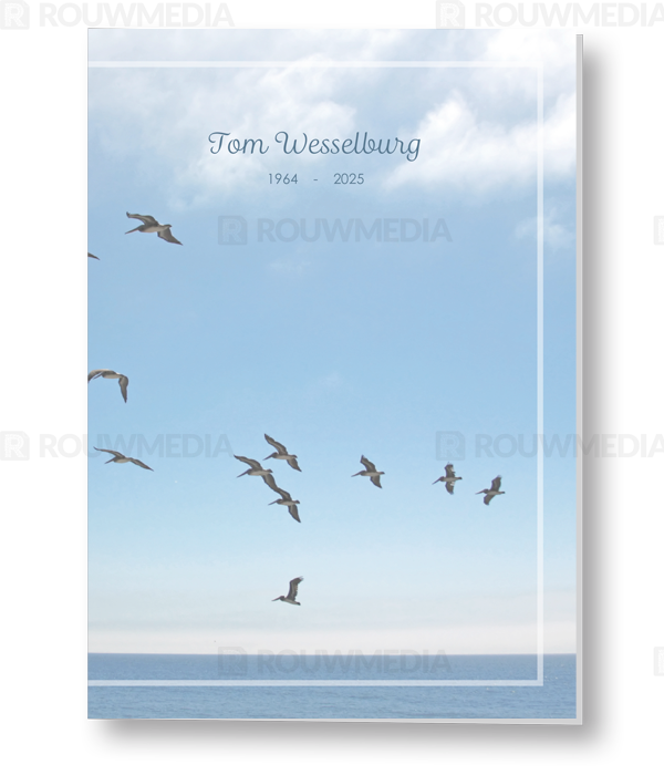 In de staande rouwkaart wordt een beeldvullende foto weergegeven van vliegende vogels boven de zee.