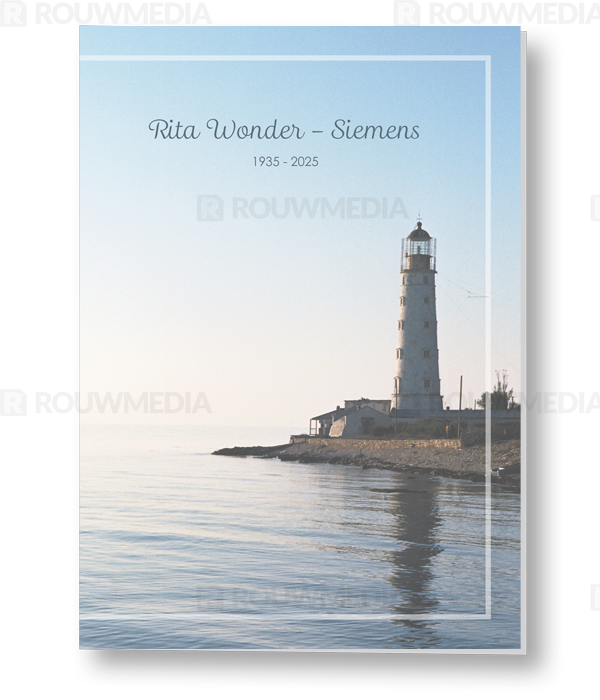 In de staande rouwkaart wordt een beeldvullende foto weergegeven van een vuurtoren bij kalm water.