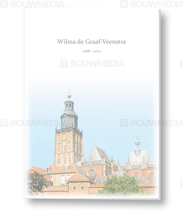 In deze staande rouwkaart wordt een beeldvullende afbeelding weergegeven van de Walburgiskerk in Zutphen. boven de afbeelding kunt u de naam en datums weergeven.