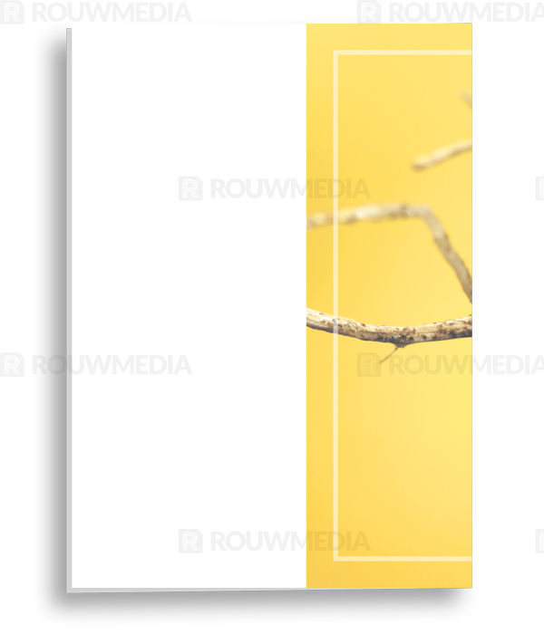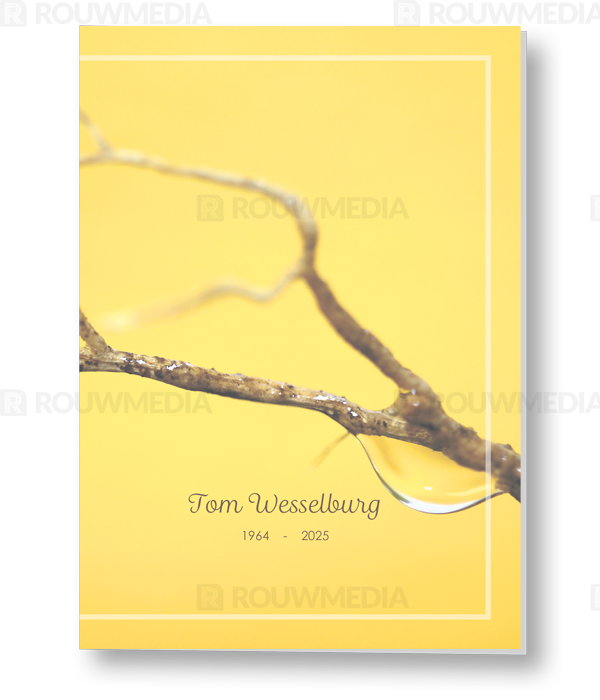 In de staande rouwkaart wordt een beeldvullende foto weergegeven van waterdruppel aan een tak op een gele achtergrond.