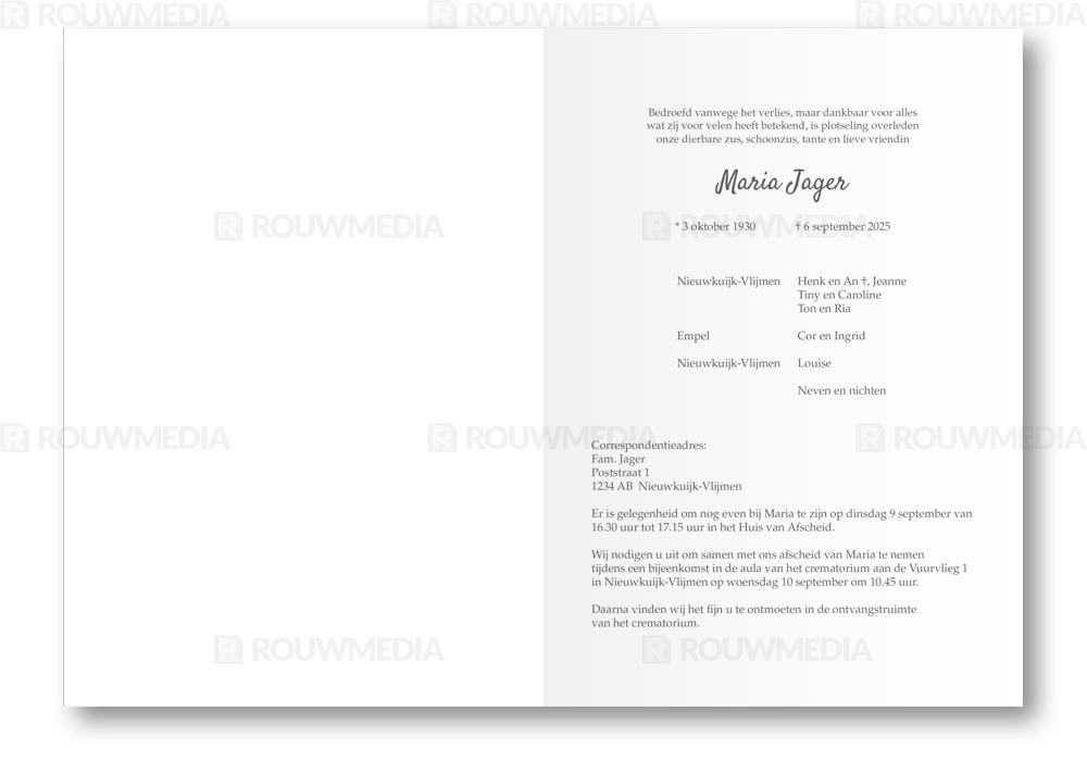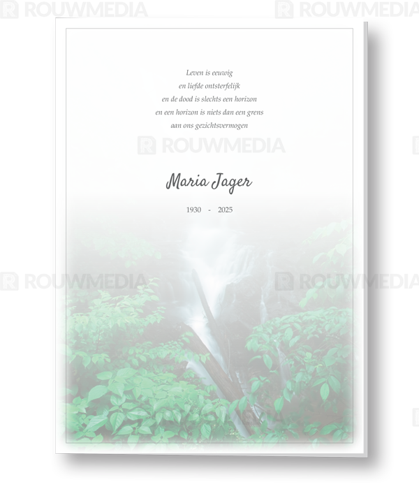 In deze staande rouwkaart wordt een beeldvullende afbeelding weergegeven van een waterval in groene omgeving. Daarnaast is het mogelijk om de naam, datums en gedicht/citaat weer te geven.