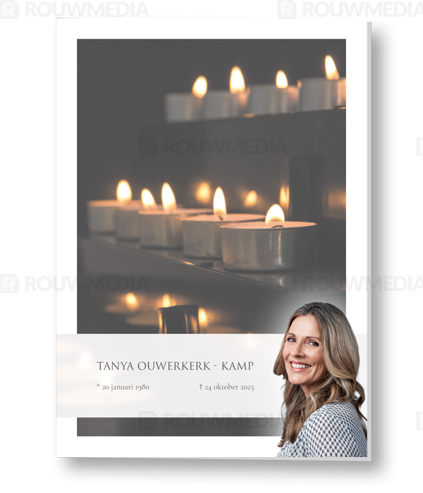 In de staande rouwkaart wordt een beeldvullende foto weergegeven van waxinelichtjes. Daarnaast is het mogelijk om een portret/foto naar eigen keuze rechts weer te geven naast de naam en datums.