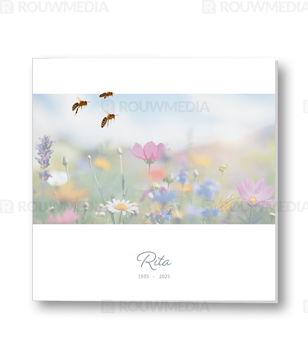 Op deze rouwkaart worden wilde veldbloemen getoond waarbij een aantal bijen vliegen.