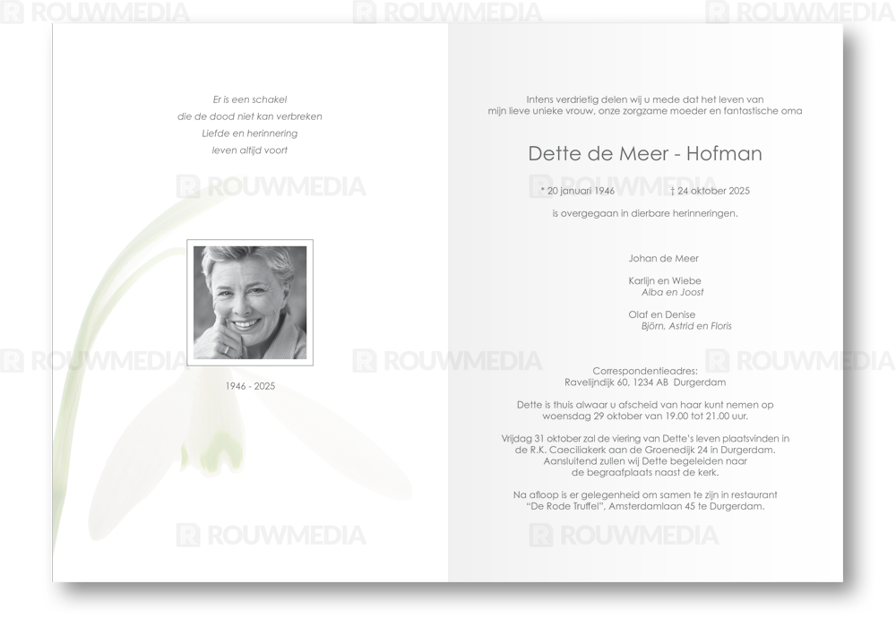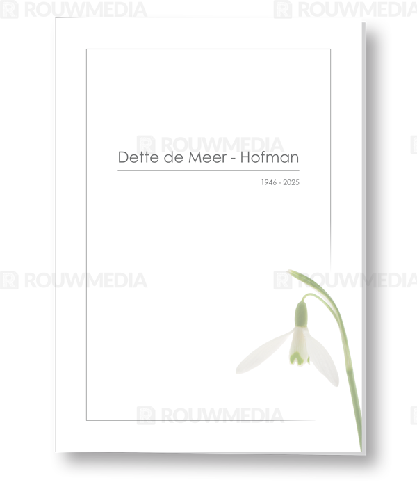 Deze rouwkaart toont in een simpele stijl hoe een afbeelding de focus kan krijgen in een kaart, maar wel de serene rust bewaart. Voor deze kaart is er gekozen voor een winterklokje.