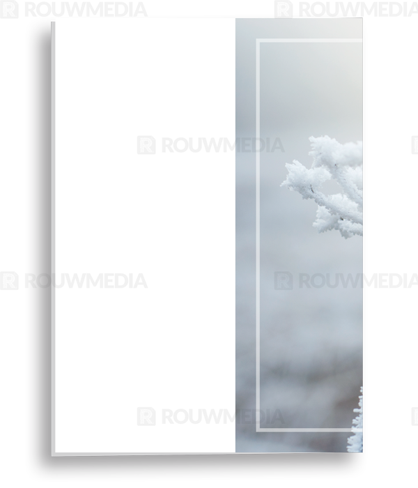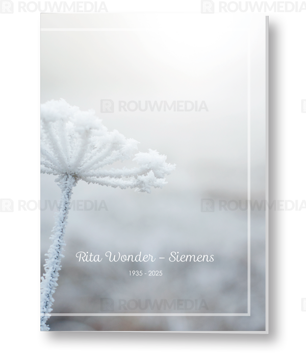 In de staande rouwkaart wordt een beeldvullende foto weergegeven van een winterse bloem in de sneeuw.