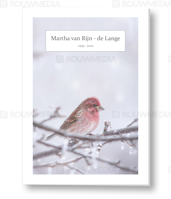 In de staande rouwkaart wordt een beeldvullende foto weergegeven van een vogel op een bevroren tak.
