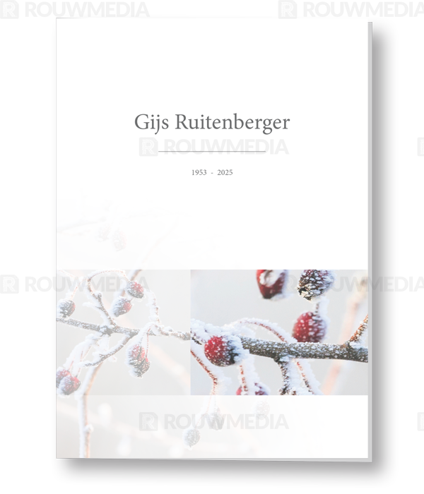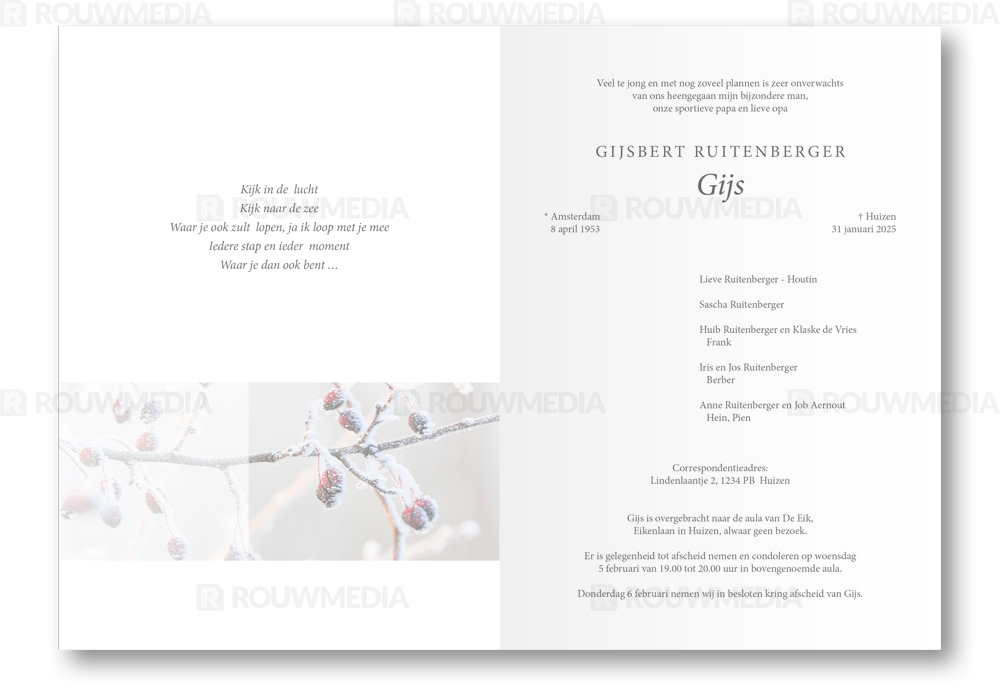 Op deze staande rouwkaart worden wintertakken weergegeven. Daarboven is het mogelijk om een naam met datums weer te geven.