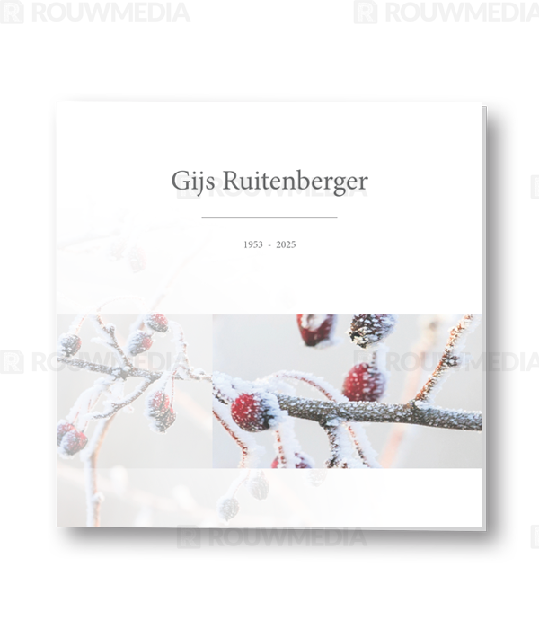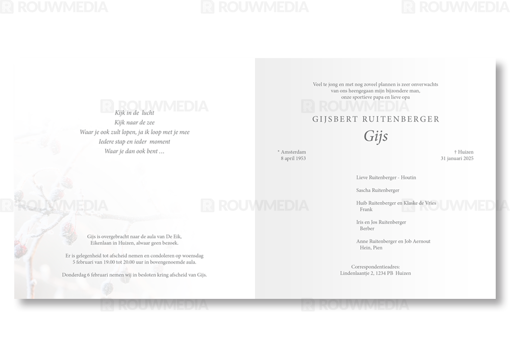 Op deze staande rouwkaart worden wintertakken weergegeven. Daarboven is het mogelijk om een naam met datums weer te geven.