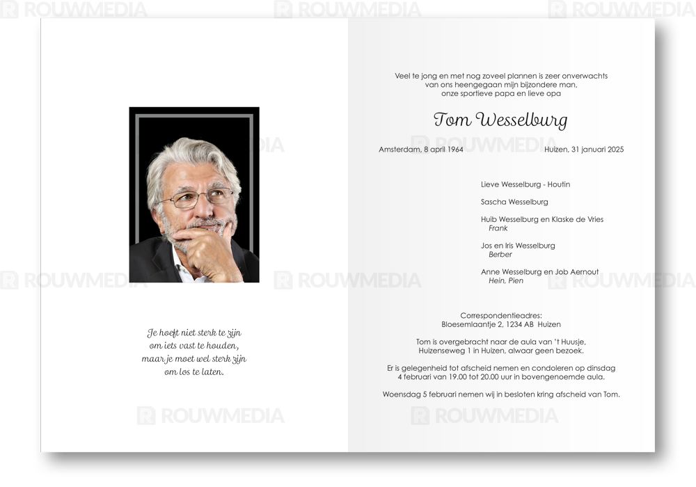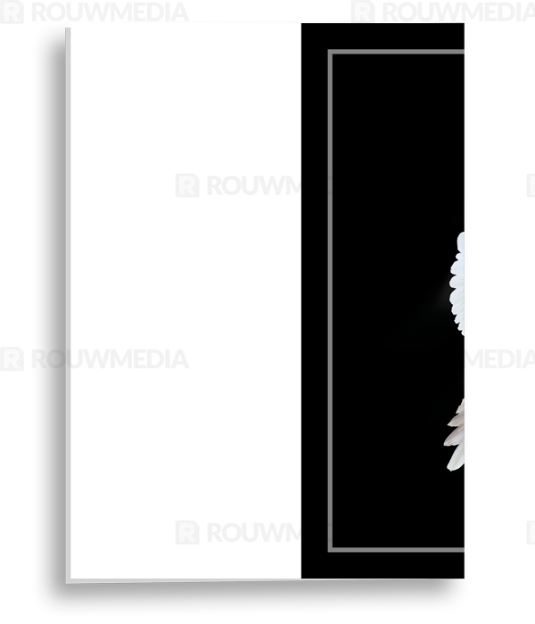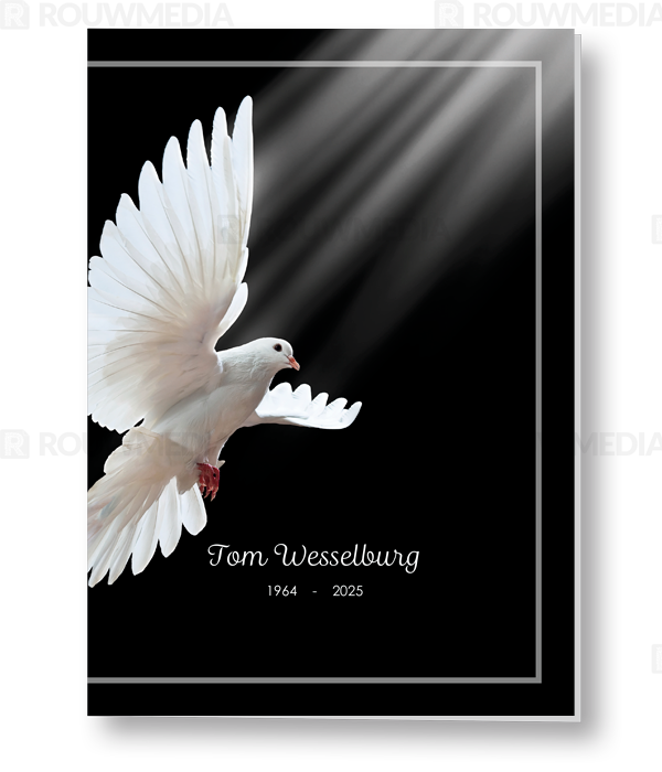 In de staande rouwkaart wordt een beeldvullende foto weergegeven van een vliegende witte duif.