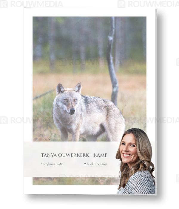 In de staande rouwkaart wordt een beeldvullende foto weergegeven van een wolf op de heide. Daarnaast is het mogelijk om een portret/foto naar eigen keuze rechts weer te geven naast de naam en datums.