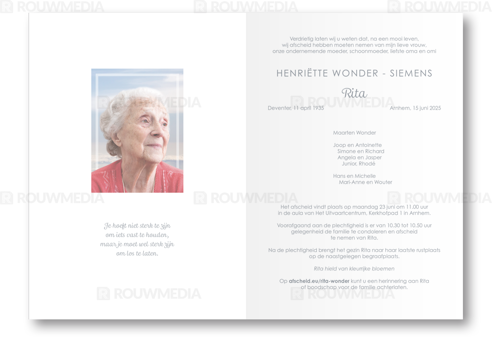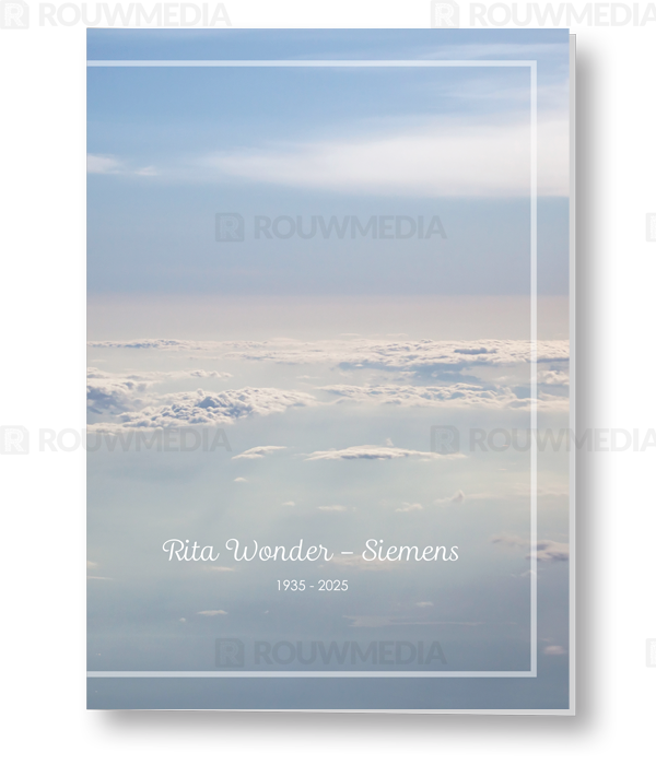 In de staande rouwkaart wordt een beeldvullende foto weergegeven van wolkenvelden.