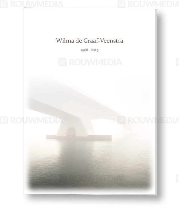 In deze staande rouwkaart wordt een beeldvullende afbeelding weergegeven van de Zeelandbrug. Boven de afbeelding kunt u de naam en datums weergeven.