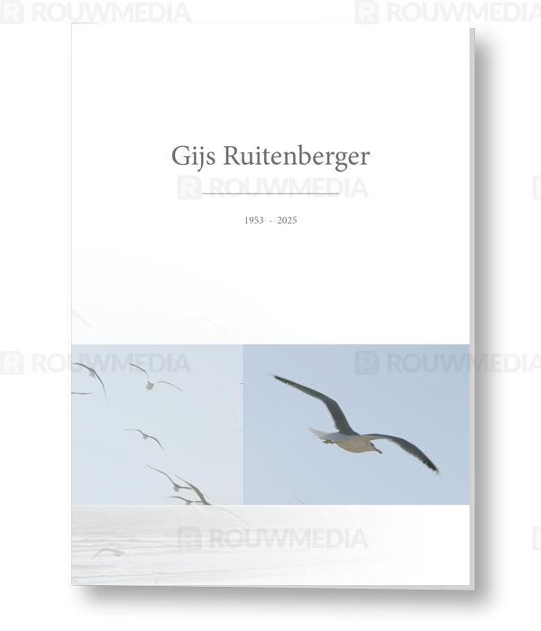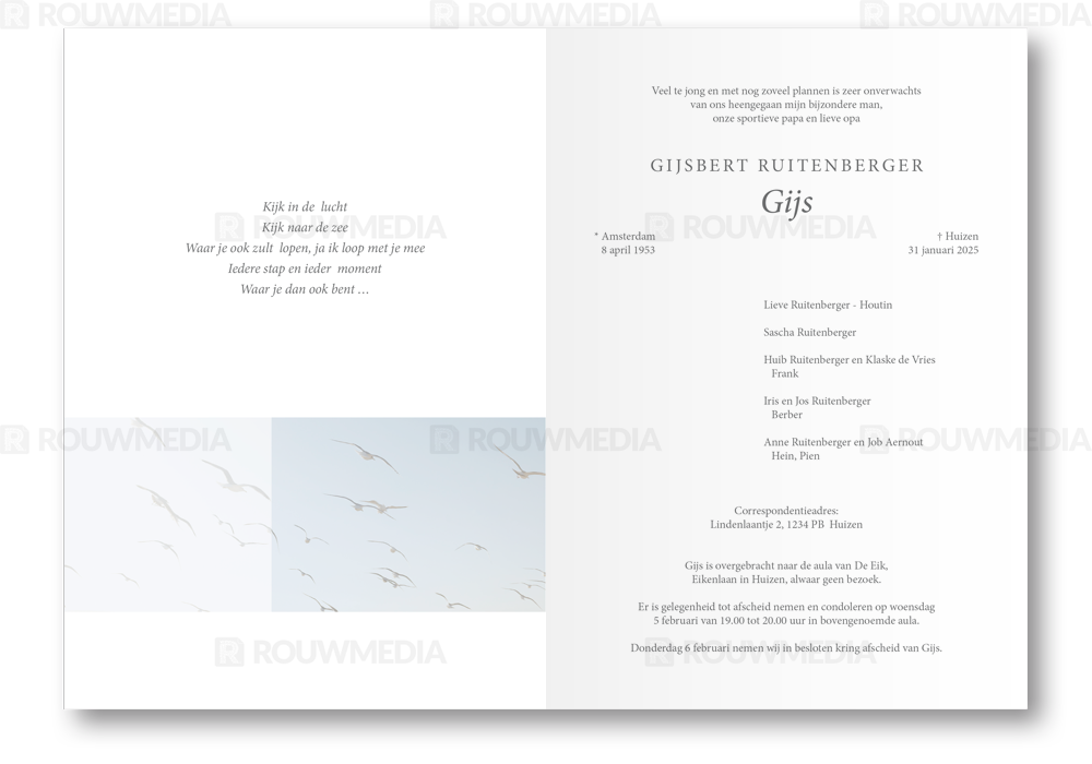 Op deze staande rouwkaart worden zeemeeuwen weergegeven. Daarboven is het mogelijk om een naam met datums weer te geven.