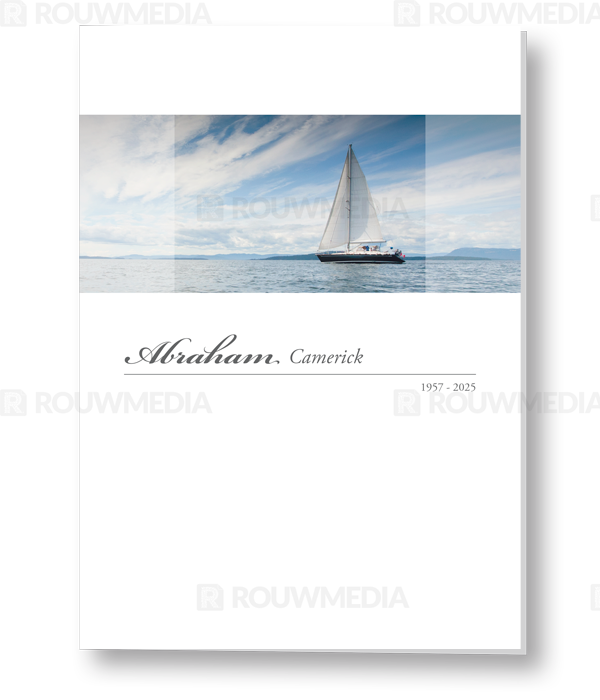 In deze rechthoekige rouwkaart wordt een horizontale afbeelding weergegeven van een zeilboot op open zee.