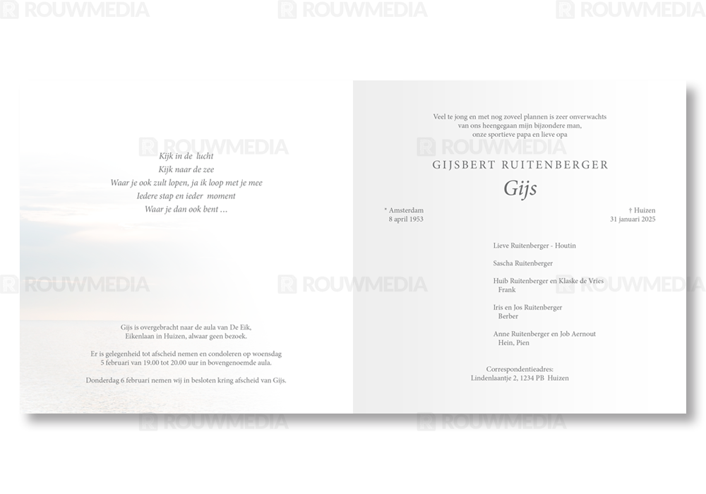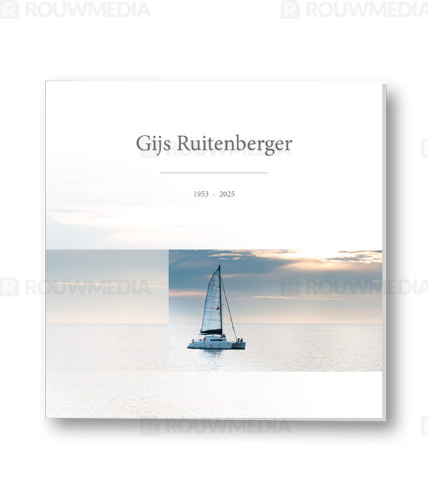 Op deze staande rouwkaart wordt een zeilboot op zee weergegeven. Daarboven is het mogelijk om een naam met datums weer te geven.