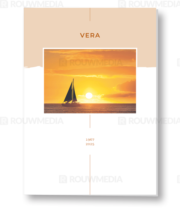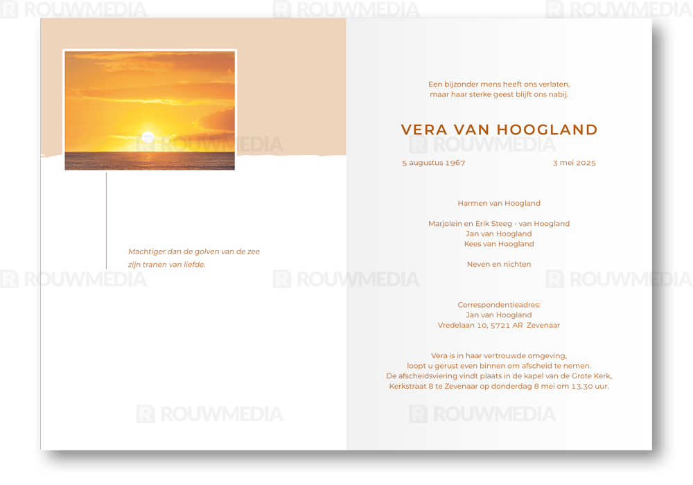 Op deze stijlvol vormgegeven rouwkaart met warme kleuren staat een zeilboot tegen een ondergaande zon.